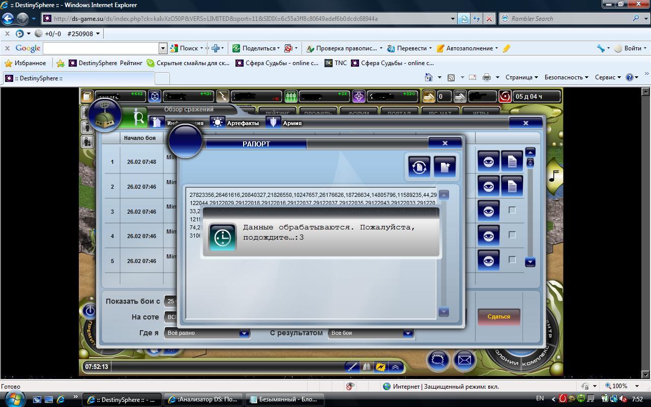 -Пытался безуспешно обновится до 7ч10мин, после чего нажал рефреш на станице браузера - игра незагрузилась, нажал второй раз - игра загрузилась и примерно в 7ч12 минут произошло первое обновление за бой. Передомной предстала удручающая картин: зацеп снулен, щит сбит на 50%