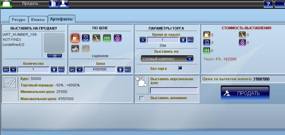 При переходе на вкладку "Артефакты" возникает ошибка. Арта нет на продажу.