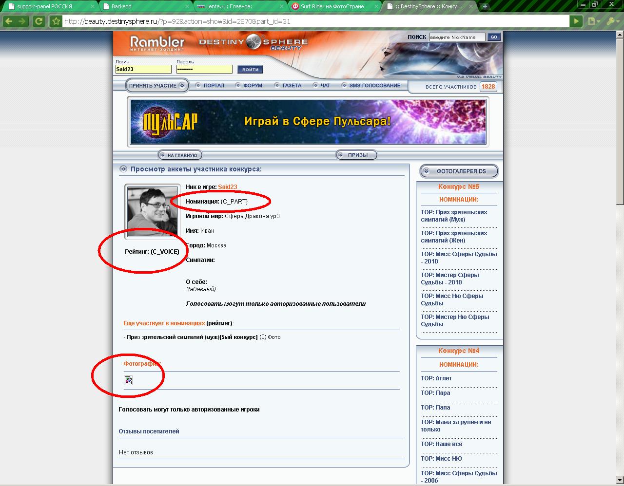 На целых 5 страницах зарегистрированных участников отсутствую. Ладно, переживу. Фотка из профиля не грузится. Бывает, что делать.. У всех в анкетах есть номинации и рейтинг. У меня какие-то крокозябры..