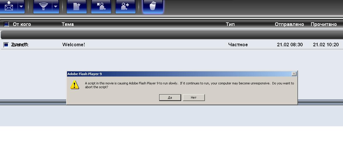 Ну честное слово..надоело уже..Пытался не обращать внимания....Но теперь когда зеленая кнопка горит непереставая, это уже не смешно...Хотел удалить все сообщения,чтоб кнопка не светилась...и выскакивает ошибка "Cause Flash Player 9"...Эта ошибка появлялясь и полгода назад....Как на WIN98SE с FlashPlayer 8, Так и на WINXP SP2 с FlashPlayer 9