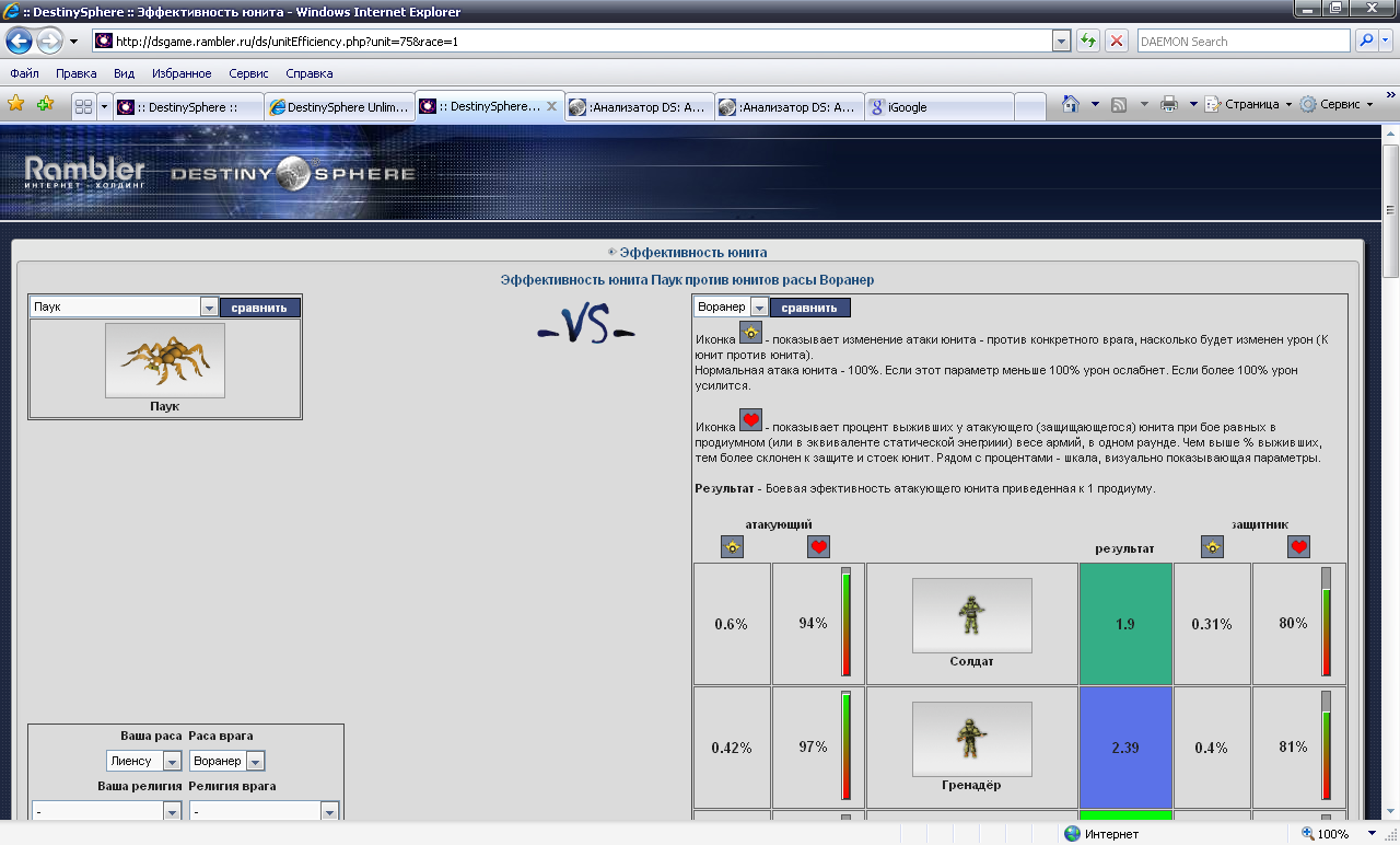 Броузер IE со всеми обновами. Уже разобралась - у тех юнитов, что не видно таблицы эффективности, нужно повторно нажать "Сравнить". Раньше показывалось сразу. Вопрос снят, спасибо. |