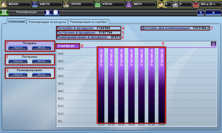 Поля (1) и (2) показывают коэффициенты потерь и постройки в продиуме. О них уже было написано ранее. С помощью этих коэффициентов высчитывается максимальный продовес, на который вы можете реинкарнировать.