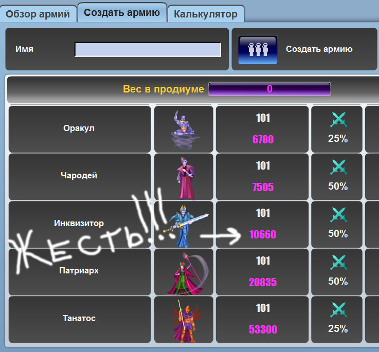 М-да... а зачем в военном калькуляторе суммируют "строчку 3", а не "строчку 2"... не говоря уж о том, зачем там вообще эта "строчка 3", если её дублирует столбик "вес в продиуме"... Это, видать, одна из очередных тайн сферы.. Даже интересно стало: в мирах РпР военный калькулятор тоже на все юниты и кнопочка "+" добавляет все 66 юнитов в армию??