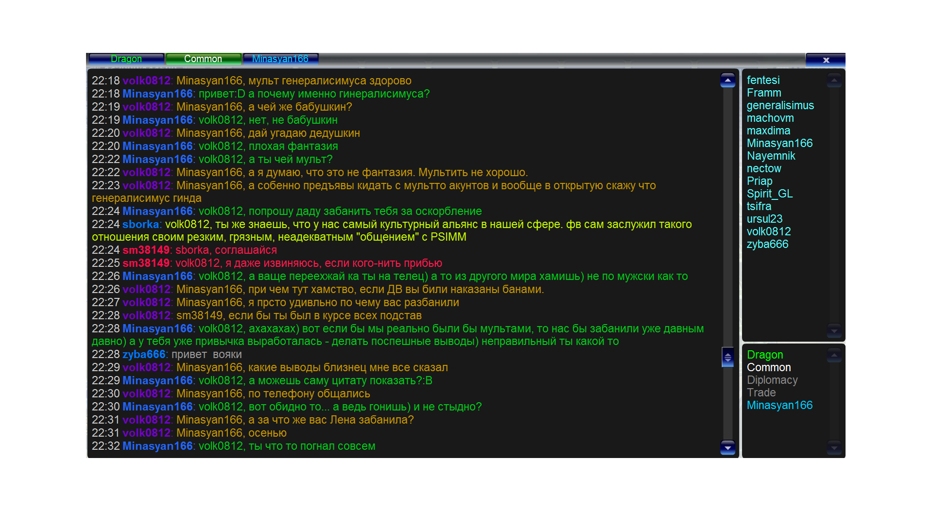Не скрою у меня конфликт с генералисимусом. Когда-то этот игрок был новичком на Драконе, я его пригласил в альянс, защищал и все такое. За это я получил от него кучу провокаций. Он пользовался в альянсе аккунтами ушедших игроков, за что был отмечен банном ДВ 21. 09. 10. И вообще распространял про меня различные ложные слухи.