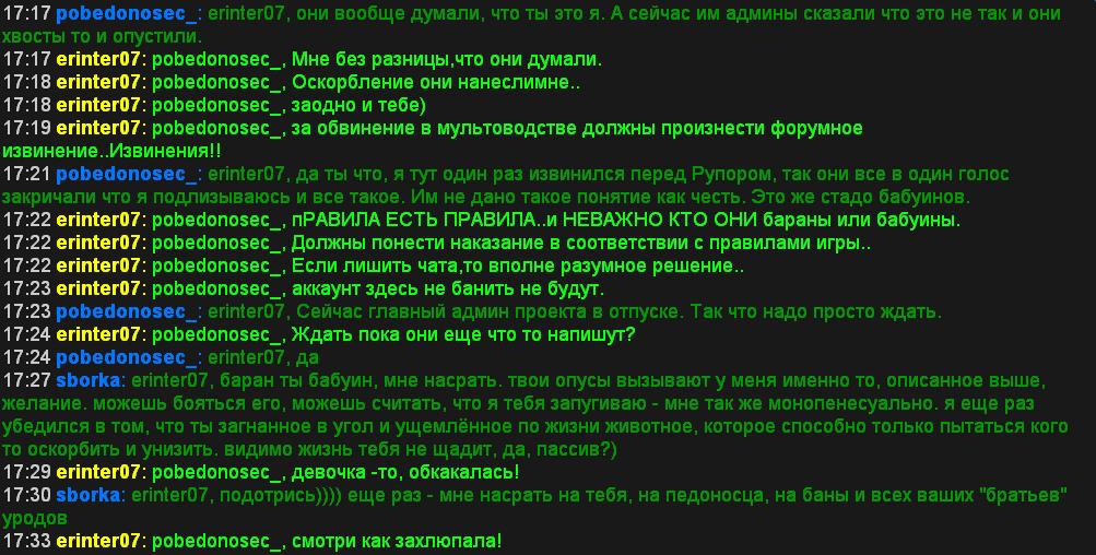 17:30 sborka: erinter07, подотрись)))) еще раз - мне насрать на тебя, на педоносца, на баны и всех ваших "братьев" уродов