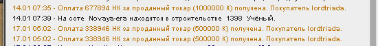 15.01 10:37 - Оплата 1914354 НК за проданный товар (500000 П) получена. Покупатель kittyk91. 15.01 10:37 - Армия qweyy игрока HEO вступила в бой на соте Lelik (4.371.4) игрока plekhanvaleksejj. 15.01 10:37 - Армия qwetttttttttt игрока HEO вступила в бой на соте aleksey (4.371.3) игрока plekhanvaleksejj.