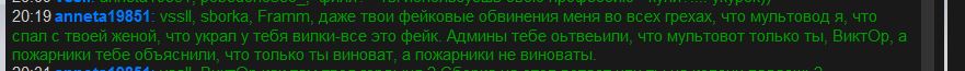 20:19 anneta19851: vssll, sborka, Framm, даже твои фейковые обвинения меня во всех грехах, что мультовод я, что спал с твоей женой, что украл у тебя вилки-все это фейк. Админы тебе оьтвеьили, что мультовот только ты, ВиктОр, а пожарники тебе объяснили, что только ты виноват, а пожарники не виноваты.