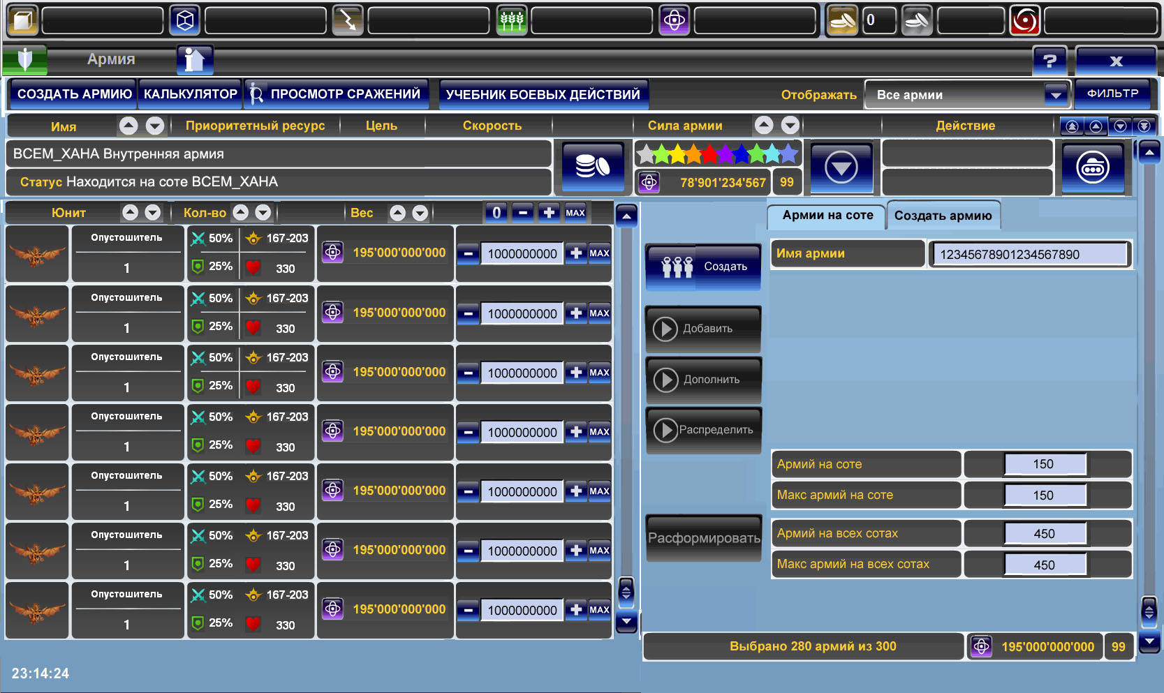 Далее, несколько переработан редактор создания армии. На данном рисунке при создании армии нет возможности вписания координат будущей цели, скорости полета до нее и приоритетного реса, но также в доке есть вариант с наличием данных параметров. При создании армии нельзя ее сразу послать в бой, но зато можно заранее ввести данные по атаке, чтобы потом при просмотре списка армий сразу была ясность, для чего предназначалась данная армия.