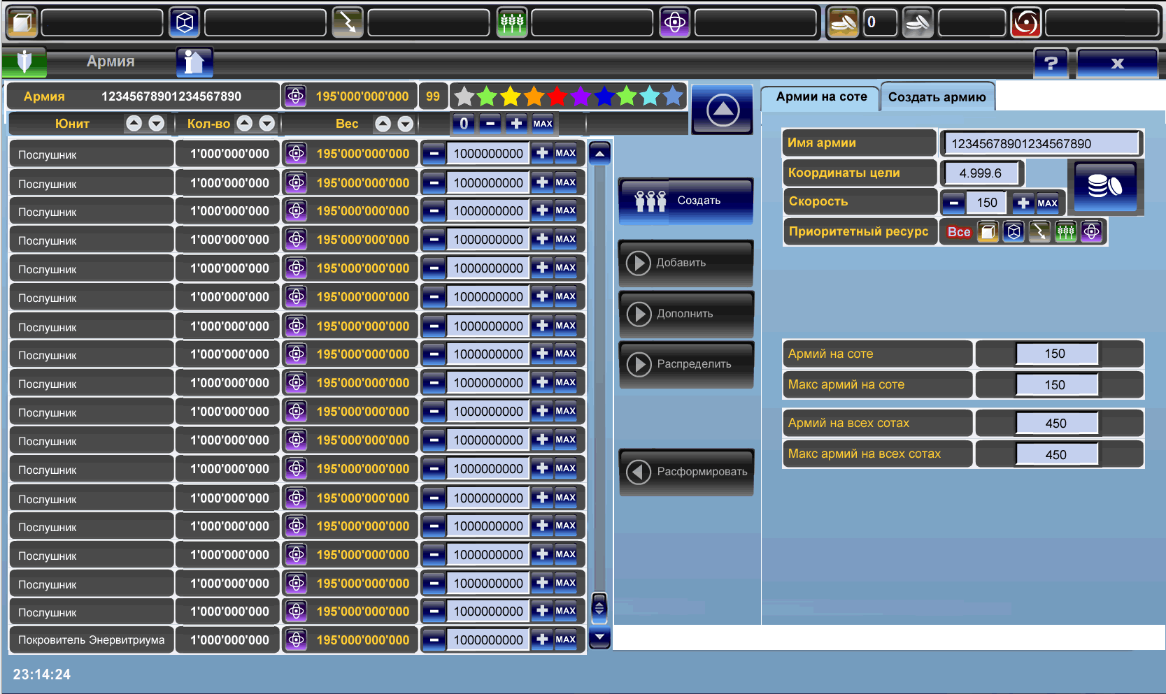 При добавлении армии сразу можно указать координаты, скорость, приоритетный ресурс. Полезно при создании сразу большого количества армий, при том, что задаваемые параметры очищаться не должны, очищается только название армии.