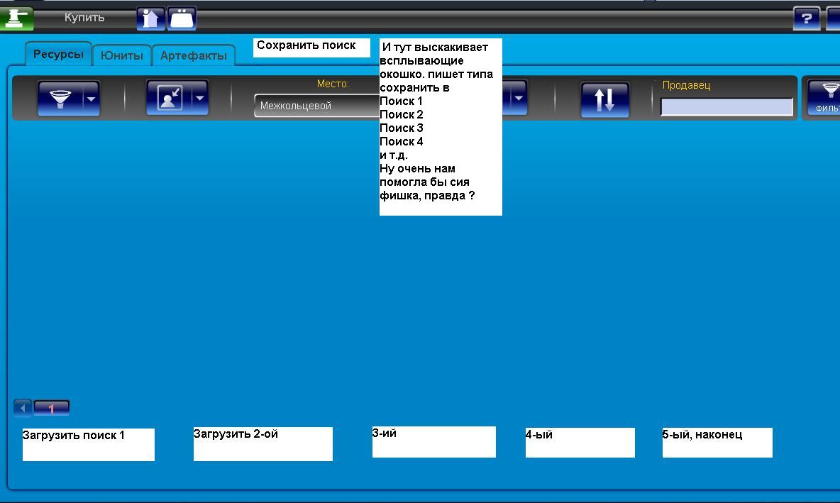 а чего там непонятного ? у меня в поиске АА - только огры,КА только на нанку тоже толькоогры,ЛА кад нана огры, ЛА стата от среднего, сферы все, Военные только огры. пока будешь везде галочки ставить замудохаешься. а так нажал одну сохранённую кнопку и вауля - выдалось одно, вторую выдалось второе, третью можно для поиска армии, 4 ресов. и не надо бояться при выборе, что промахнёшься и купишь что-то не нужное. по-моему, идея заи... хорошая.