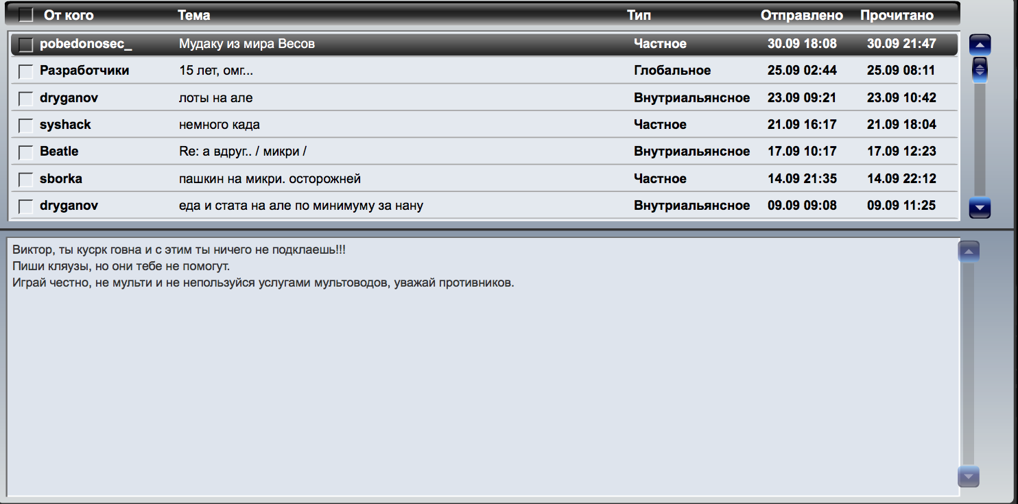 облезешь - возьму сам и полистай свой компроматы, там и найди когда ты в моём альянсе занимался крысятничеством и воровством за которое тебя потом выпнули из альянса. забыл чтоли? когда по внутриаловой зелени ходили сообщение, что эту крысу тёму надо удалять из альянса, что ты мудак и т.п., а? когда ты испугался и пустился наутёк из альянса который тебе давал самый большой бонус на добычу ресов, одалживал серу, давал арты по минимальным в сфере ценам, а ты потом их перепродавал на МКТ? что, утырок, вспомнил? вот уткнись в своё гaвно, разведённое в чатах и форумах, и засыхай, не воняя больше.