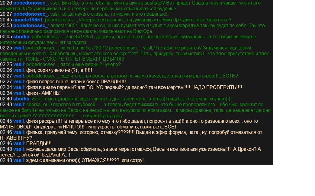 00:05 sborka: pobedonosec_, anneta19851, девочки, вы бы в чате альянса бонус шушукались.. а то своим ни кому не интересным флудом весь чат загадили