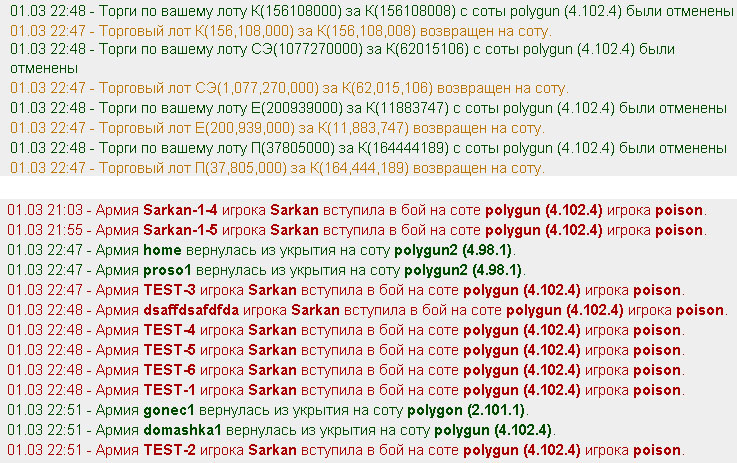Обратите внимание на время возврата лотов с торгов, и время и порядок прилета армий: развед за два часа, развед за час, развед за минуту, и через несколько десятков секунд после выпадения лотов с торгов два пробоя и грабля на 1ккк. Остальные армии - для отвлечения внимания, по 1 юниту. Излишне говорить, что ресурсы были увезены. До этого месяц никто не летал - и вдруг такая точность из ничего!