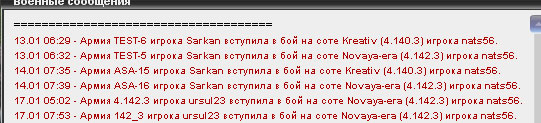 15.01 10:37 - Оплата 1914354 НК за проданный товар (500000 П) получена. Покупатель kittyk91. 15.01 10:37 - Армия qweyy игрока HEO вступила в бой на соте Lelik (4.371.4) игрока plekhanvaleksejj. 15.01 10:37 - Армия qwetttttttttt игрока HEO вступила в бой на соте aleksey (4.371.3) игрока plekhanvaleksejj.