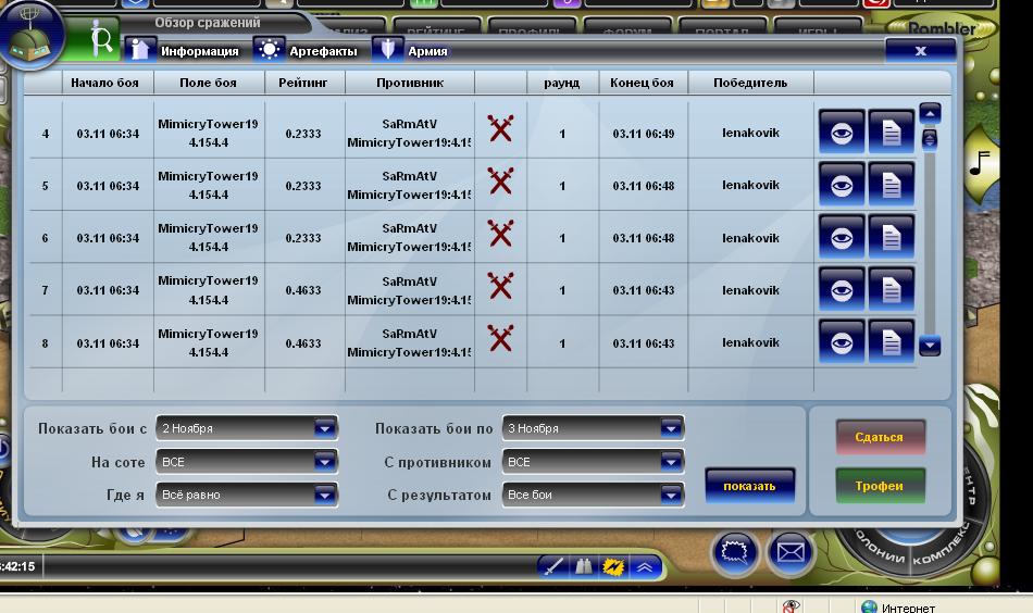 На соте "MimicryTower19 (4.154.4)" игрока SaRmAtV завершен бой (03.11 06:43).