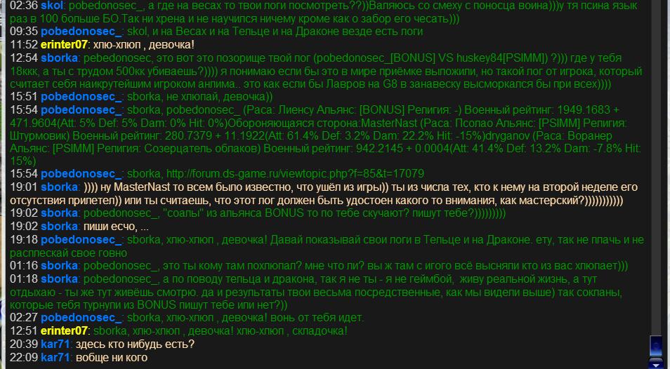 15:54 pobedonosec_: sborka, viewtopic.php?f=85&t=17079 19:01 sborka: )))) ну MasterNast то всем было известно, что ушёл из игры)) ты из числа тех, кто к нему на второй неделе его отсутствия прилетел)) или ты считаешь, что этот лог должен быть удостоен какого то внимания, как мастерский?)))))))))))
