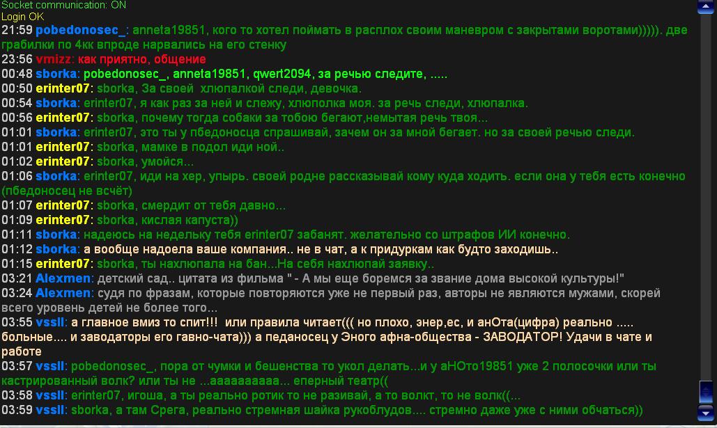 03:55 vssll: а главное вмиз то спит!!! или правила читает((( но плохо, энер,ес, и анОта(цифра) реально ..... больные.... и заводаторы его гавно-чата))) а педаносец у Эного афна-общества - ЗАВОДАТОР! Удачи в чате и работе