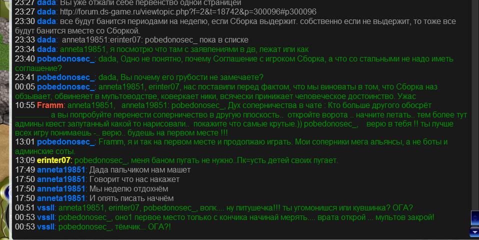 00:05 pobedonosec_: anneta19851, erinter07, нас поставили перед фактом, что мы виноваты в том, что Сборка наз обзывает, обвинеяет в мультоводстве, коверкает ники, всячески принижает человеческое достоинство. Ужас