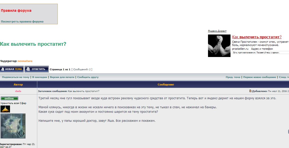 Третий месяц мне гугл показывает везде куда встроен рекламу чудесного средства от простатита. Теперь вот и яндекс-дерикт на нашем форуме взялся за это.